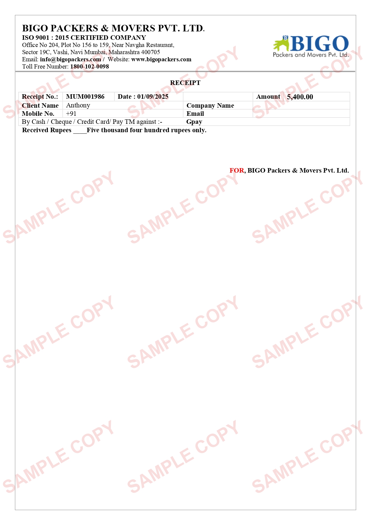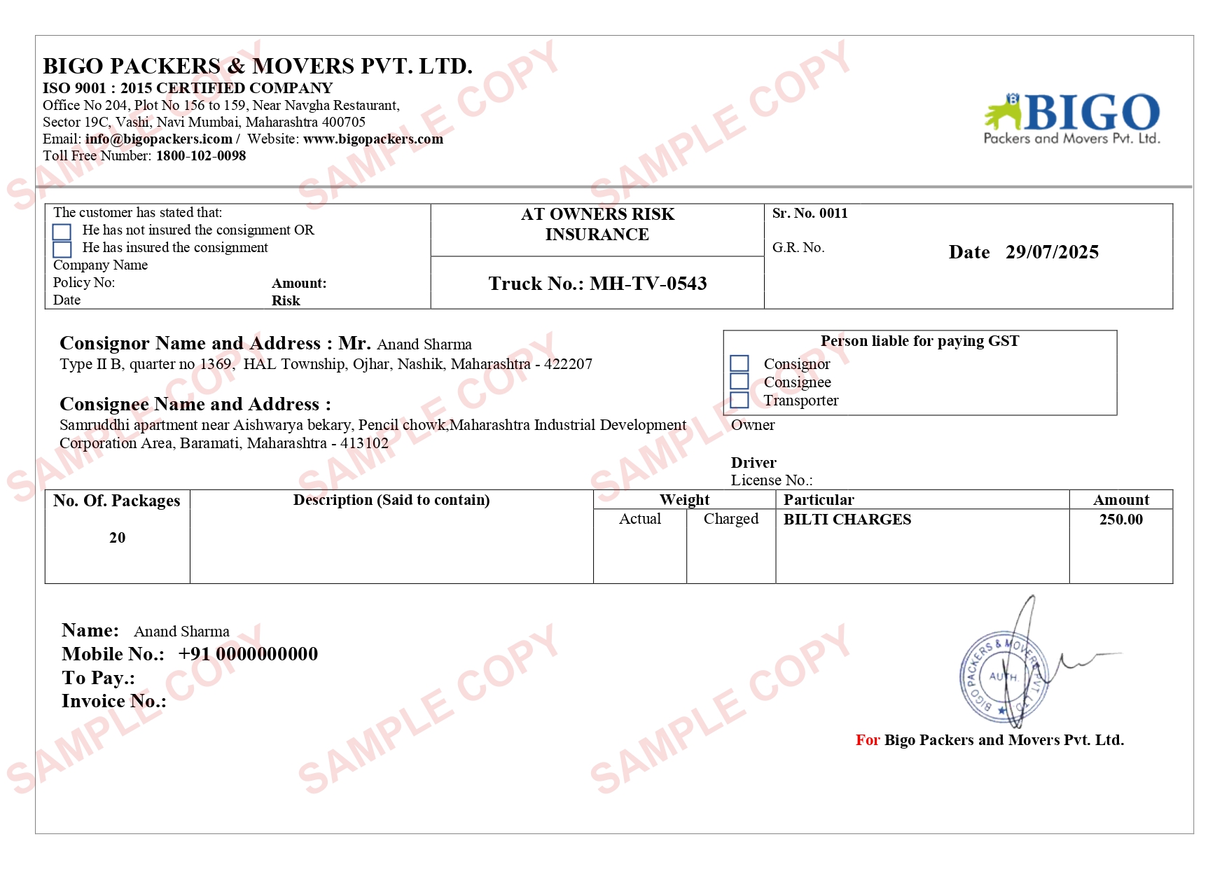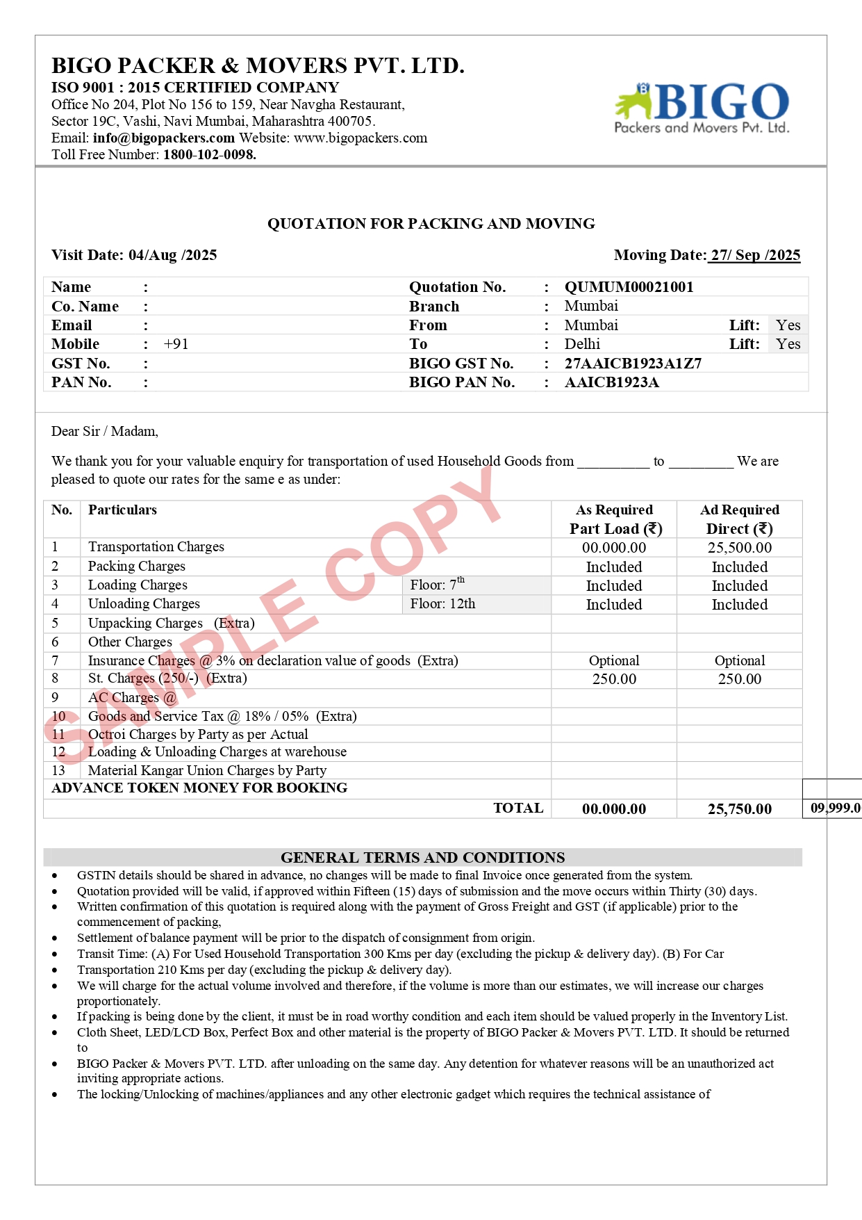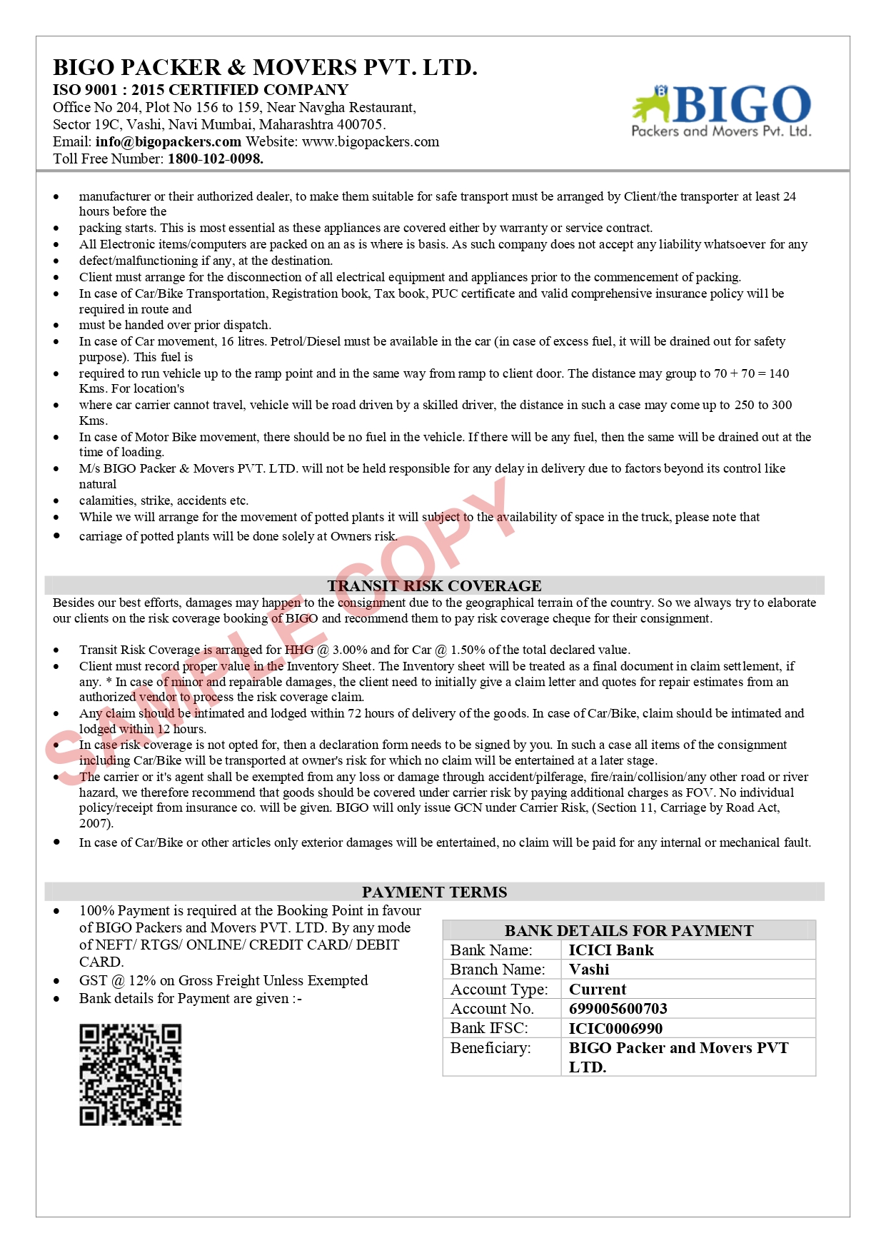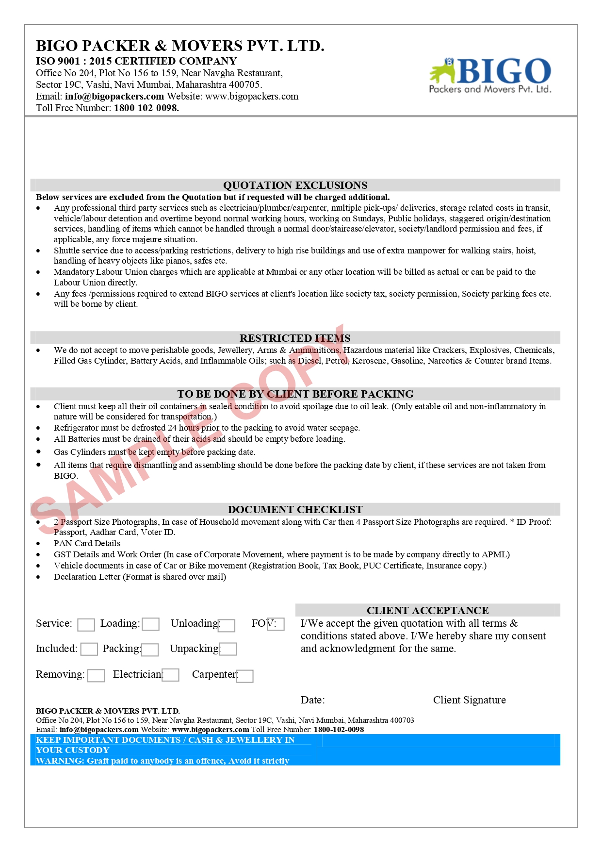 Documents Provided by Bigo Packers and Movers Pvt. Ltd.