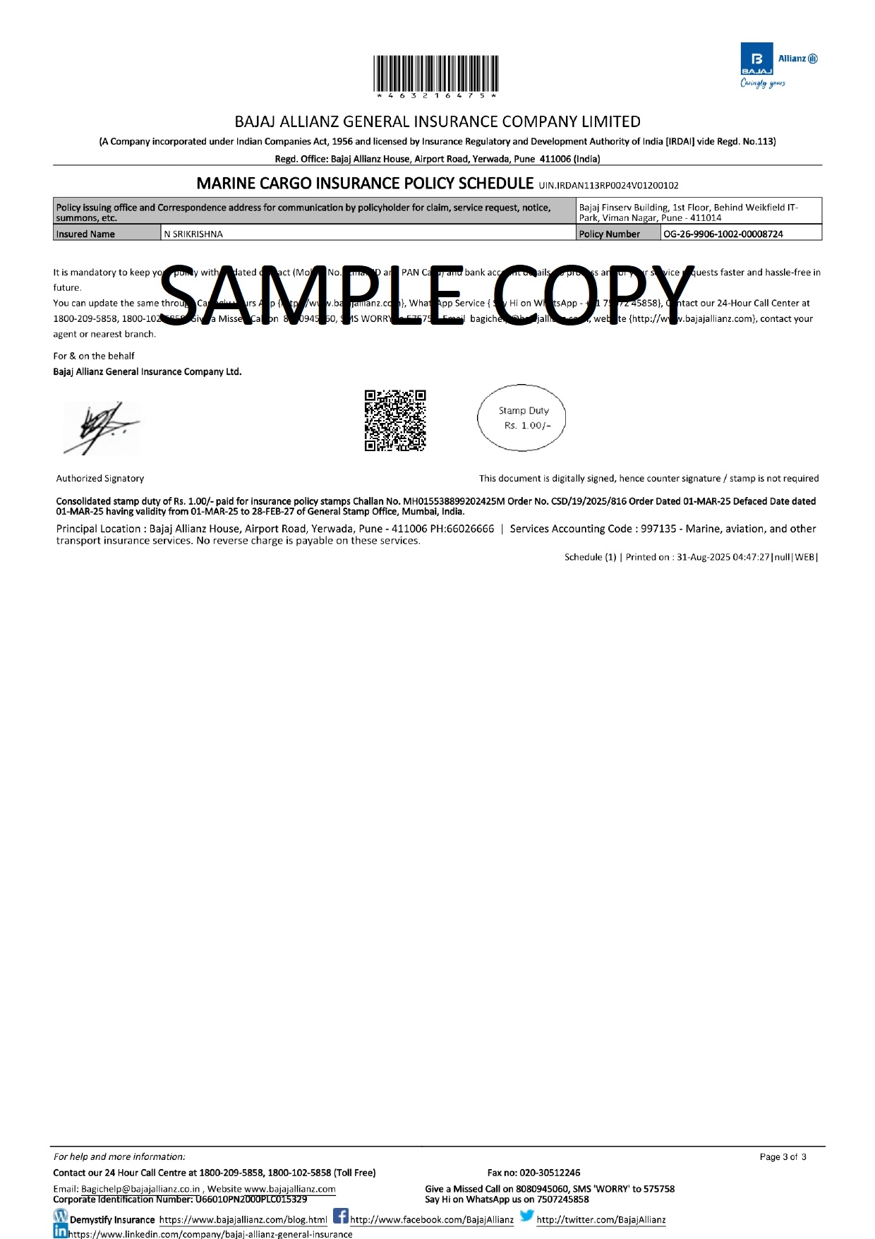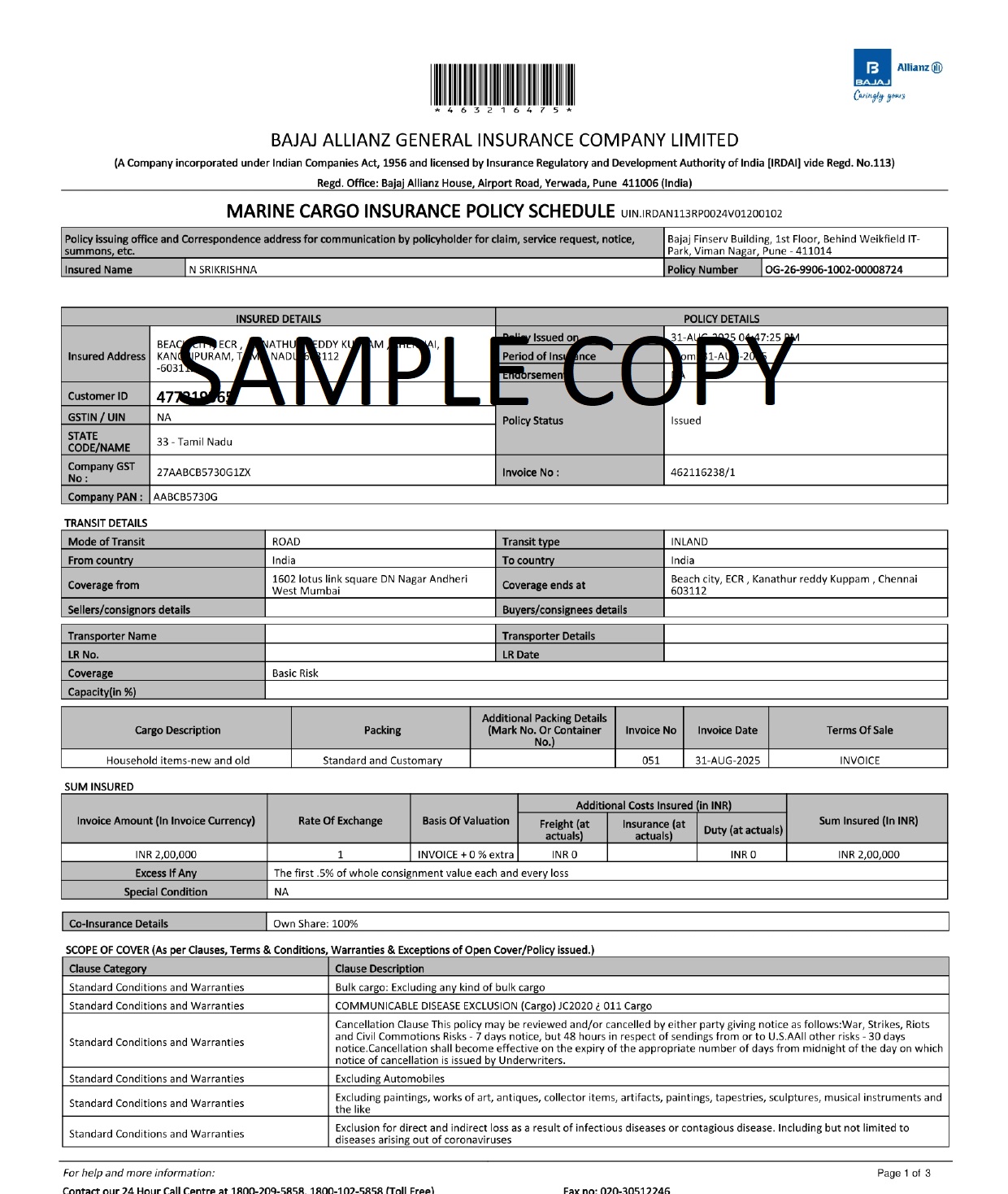 Yes, transit insurance details are attached along with the bill. A copy of the insurance policy is provided for claim settlement in case of damage or loss.