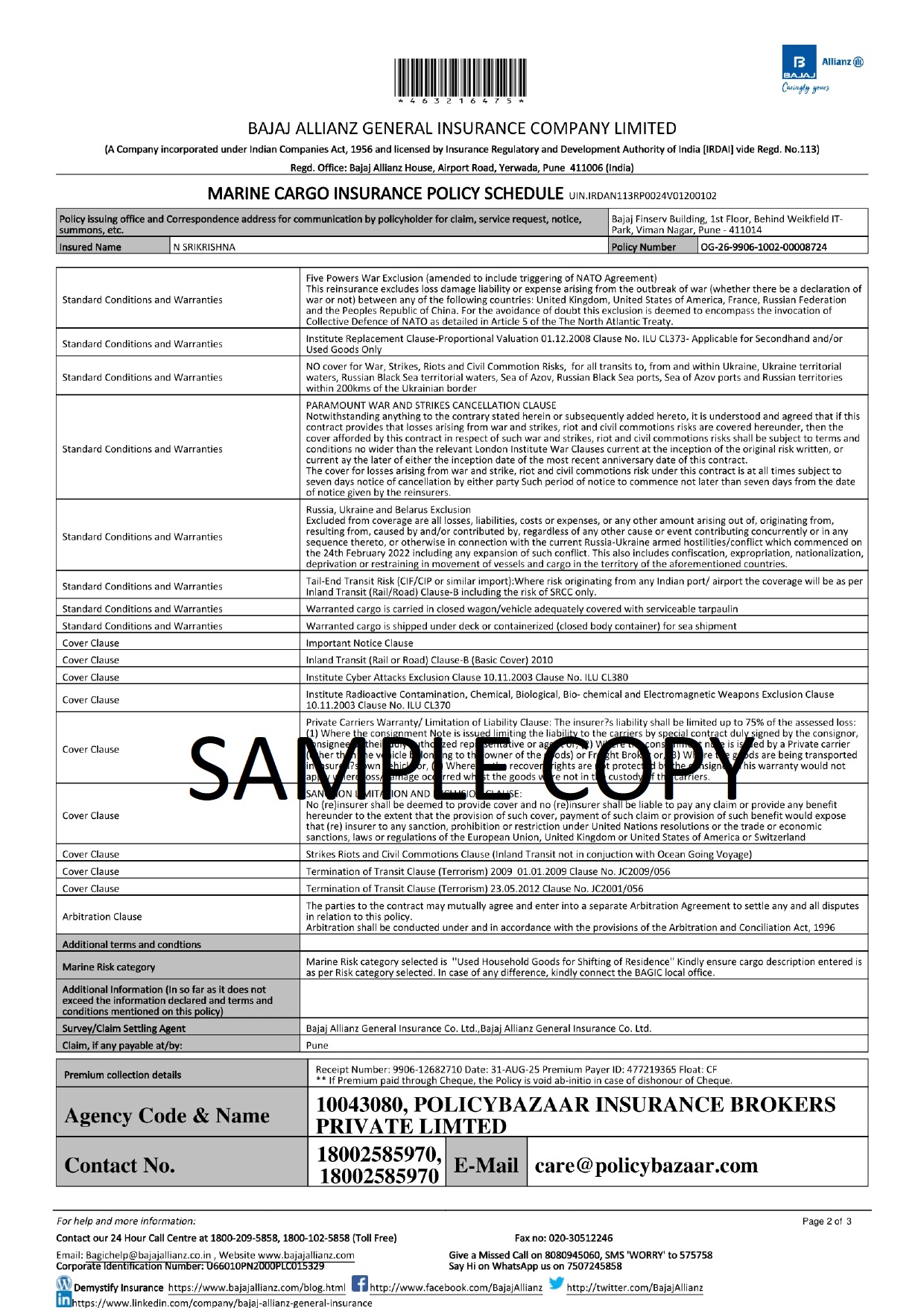 Copy of goods transit insurance policy, covering damage or loss during shifting.