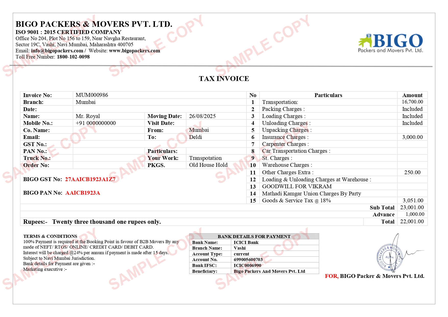 Normally, the IBA approved GST invoice is issued within 24–48 hours after delivery of goods. In case of urgent requirement, Bigo Packers and Movers provides the invoice immediately on request.